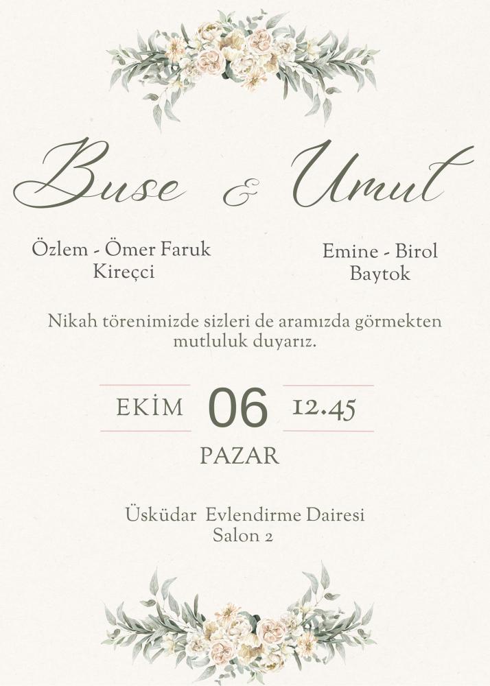 Emine ve Birol Baytok kardeşlerimizin oğlu Umut ile Buse kızımızın nikah törenlerine tüm dost, akraba ve köylülerimiz davetlidir.’’Emine kardeşimiz Lütfi Kanbay amcamızın kızıdır’’