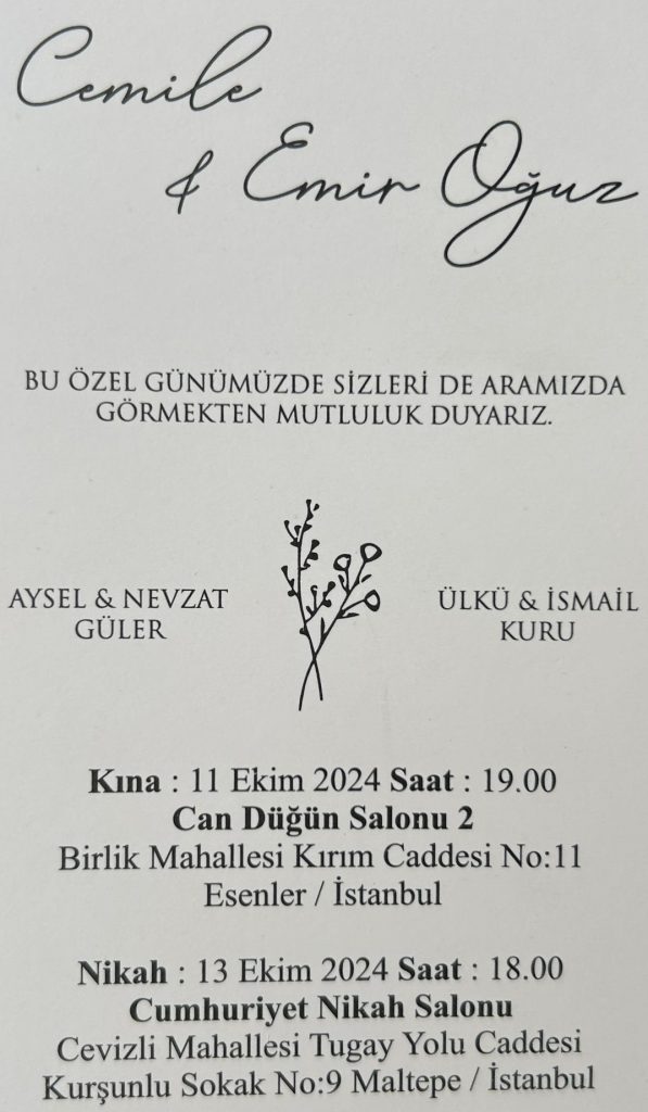 NİKAH : 13 Ekim 2024 Pazar Saat : 18:0 CUMHURİYET NİKAH SALONU Cevizli Mahallesi Tugay Yolu Caddesi Kurşunlu Sokak No: 9 Maltepe-İstanbul