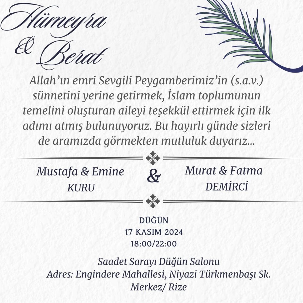 DÜĞÜN: 17 Kasım 2024 Pazar Saat 18.00 – 22.00 SAADET SARAYI DÜĞÜN DÜĞÜN SALONU ADRES : Engindere Mahallesi Niyazı Türkmenn Başı Sokak MERKEZ – RİZE
