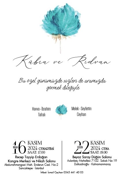 Havva yengemiz ve İbrahim TAFRALI ‘’ÇERİMİ’’ kardeşimizin kızı yeğenimiz KÜBRA ile RIDVAN‘ın 16 Kasım günü İstanbul’da yapılacak NİKAH merasimlerine ve 22 Kasım günü Kahramanmaraş’ta yapılacak düğün merasimlerine tüm dost, akraba ve köylülerimiz davetlidir.